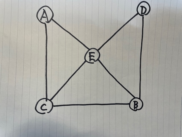 ここで、図 1 で、ノード E は要接点となります。なぜならば、E が機能しているときは、A から D への経路は A → E → D と 2 step になりますが、E が壊れてしまうと、A → C → B → D と、ステップがひとつ増えてしまいます。そして、この場合の E の迂回度は(ステップが 1 増えるので)1 と定義します。