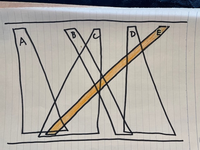図 1 の台形グラフは、通常のノードとエッジからなるグラフです。図 2 の台形モデルは、図 1 と次のように対応します。図 2 の台形 A, B, C, D, E は 図 1 のノード A, B, C, D, E に対応します。図 2 の台形 A と C が交差している部分は、図 1 のノード A と C を結ぶエッジに相当します。図 2 の他の台形の交差している部分についても同様です。